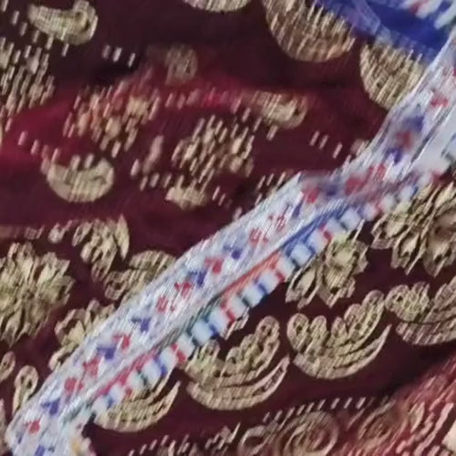 The blouse is newly stitched using rich velvet and printed fabrics, combined with original vintage Rabari hand-embroidered textile panels placed at the bottom and side sections. These embroidered pieces are approximately 15–20 years old and display traditional tribal motifs created by Rabari women.